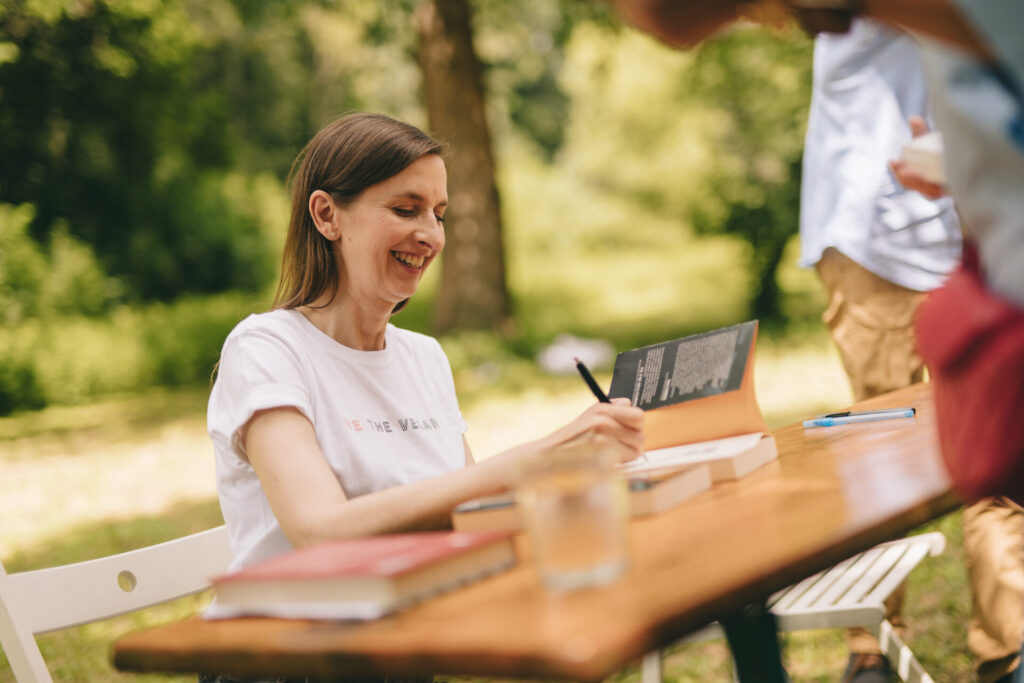 Karolina Kuszlewicz: „”Rampa, komora gazowa, testowanie silników do gazowania, zniknie milionów istnień w ciągu każdej godziny – coś Wam to przypomina?” – pytaliśmy wczoraj ze sceny podczas Festiwal Góry Literatury. To był dla mnie ogromny zaszczyt, że mogłam poprowadzić tę rozmowę z Sylwia Spurek i Bartek Sabela. Punktem wyjścia była „Wędrówka tusz” autorstwa Bartka, ale na stole leżała także książka Sylwii „Smród, krew i łzy. Włącz myślenie, bądź zmianą” – obie pozycje opisujące drobiazgowo krzywdę zwierząt wywołaną żądzą człowieka. Są i koszmarne skutki środowiskowe, w tym dla bioróżnorodności. W tej rozmowie chciałam, by w centrum były zwierzęta pozaludzkie. Opowiedzieć ich życie i śmierć. A następnie postawić pytania o to, czy biorąc pod uwagę dowody, jesteśmy wreszcie w stanie uznać tę machinę unicestwiania miliardów odczuwających istot za masową zbrodnie? Więcej – za zagładę. Technologicznie usprawnianą i opartą na dobrej organizacji i przepisach, jak gazować. To była dla mnie jedna z najważniejszych rozmów o zwierzętach, jakie odbyłam w przestrzeni publicznej w życiu. Uprzedziłam wszystkich, że zapraszam do cierpliwego trwania we własnym dyskomforcie. Nikt nie wyszedł, ba – potem jeszcze długo trwały rozmowy poza sceną.”