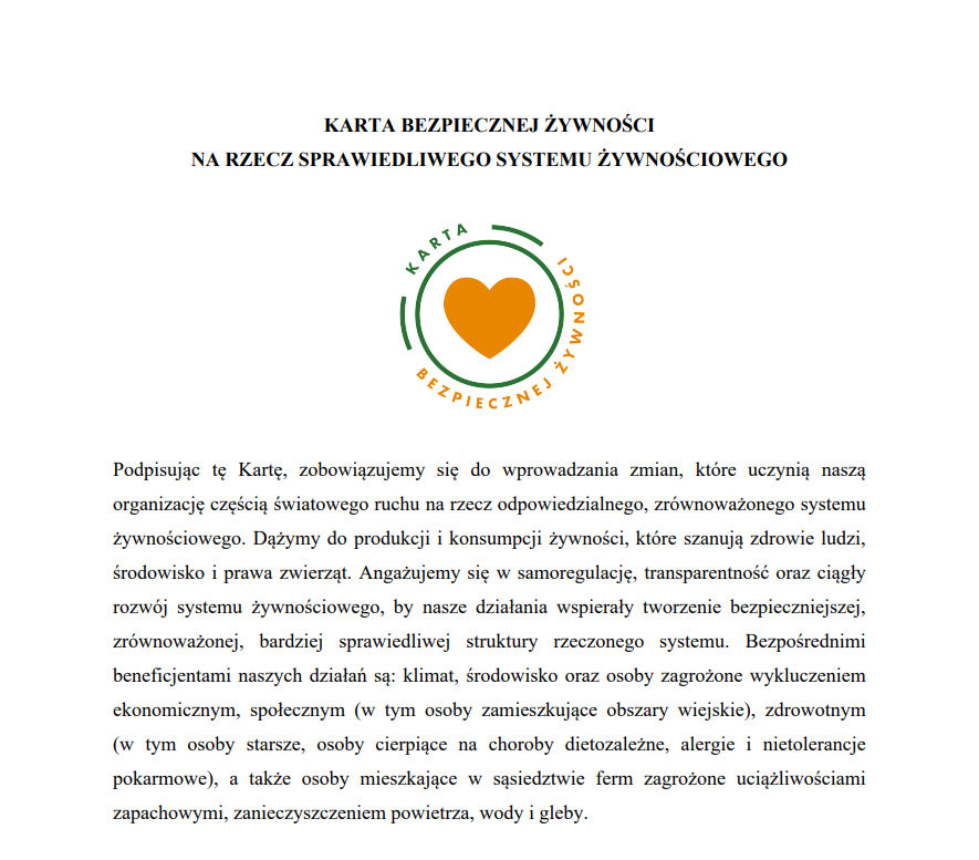 Sygnatariusze i Sygnatariuszki Karty dążą do produkcji i konsumpcji żywności w sposób, który szanuje zdrowie ludzi, środowisko naturalne oraz prawa zwierząt. Zobowiązują się do samoregulacji, przejrzystości działań oraz nieustannego doskonalenia systemu żywnościowego. Podejmowane przez nich inicjatywy mają na celu wspieranie budowy bezpieczniejszego, bardziej zrównoważonego i sprawiedliwego systemu żywnościowego.