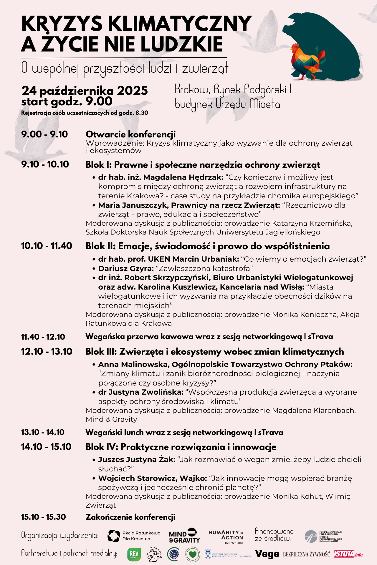 – „Zniszczenie ekosystemów to nie strata „innych” gatunków, lecz erozja podstaw naszego życia. Kiedy giną owady zapylające, zagrożone jest nasze bezpieczeństwo żywnościowe; gdy wymierają lasy, tracimy naturalne systemy regulacji klimatu; a wraz z degradacją oceanów zanika cykl, od którego zależy oddychanie każdego z nas. Mówienie o „życiu nie ludzkim” nie oznacza więc opowiadania o odległych bytach, ale o współtwórcach świata, który podtrzymuje także naszą egzystencję. Kryzys klimatyczny to kryzys relacji i współzależności – kryzys, który dotyka całości życia na Ziemi.” – podkreśla Magdalena Klarenbach z Fundacji Mind & Gravity, pomysłodawczyni i współorganizatorka wydarzenia. – „Nie możemy mówić o odpowiedzialnej przyszłości bez uwzględnienia potrzeb zwierząt, zarówno dzikich, jak i tak zwanych hodowlanych. To nie kwestia tylko empatii, ale też respektowania podstawowego prawa istot poza ludzkich do życia na planecie, którą jako ludzie zawłaszczyliśmy. Przyszłość musi być wspólna albo nie będzie jej wcale. Miasto nie musi być polem konfliktu – może stać się przestrzenią wspólnego istnienia” – dodaje Monika Konieczna ze Stowarzyszenia Akcja Ratunkowa dla Krakowa, współorganizatorka konferencji.