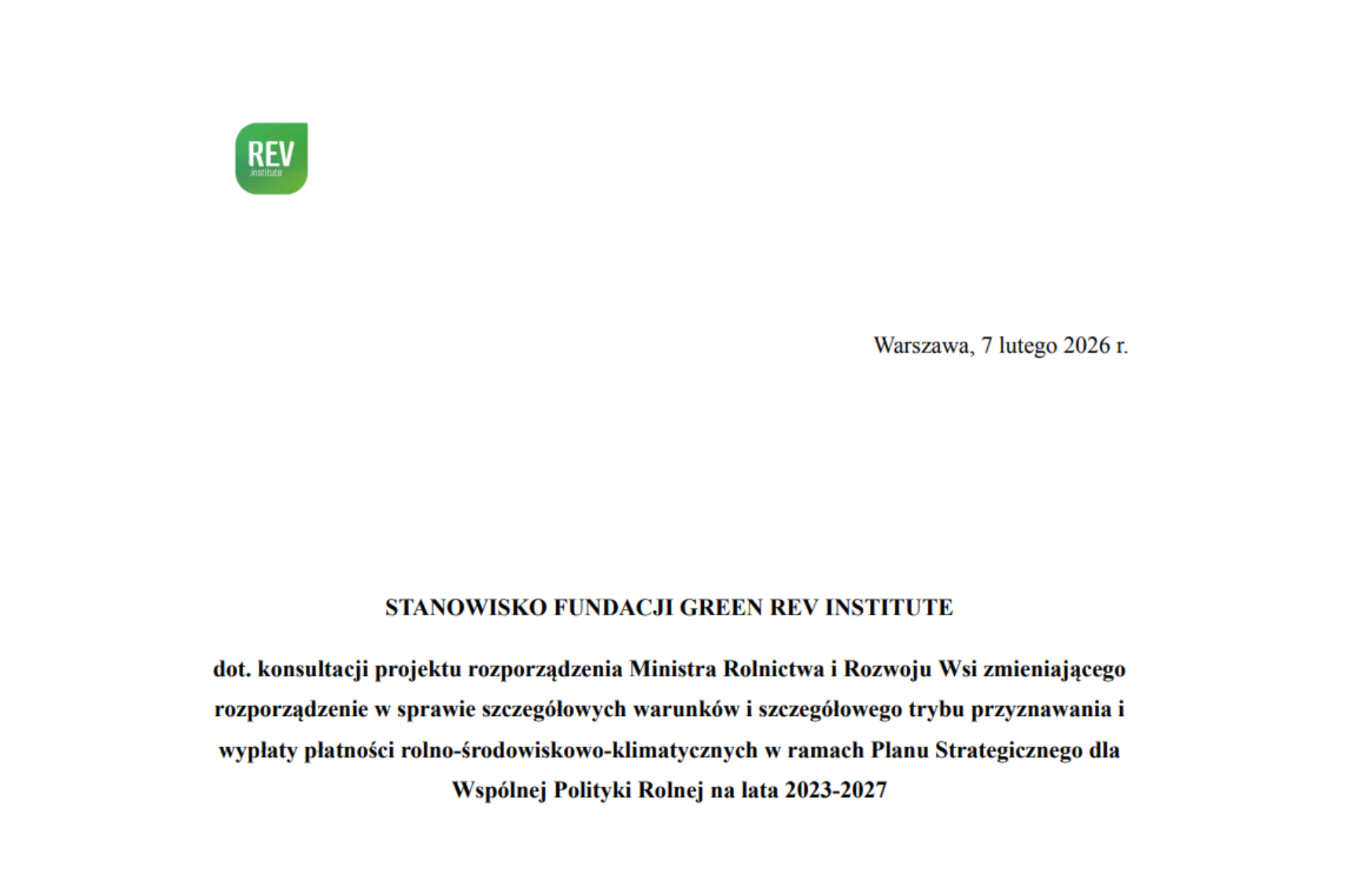 Fundacja Green REV Institute skierowała swoje stanowisko do Ministra Rolnictwa i Rozwoju Wsi w odpowiedzi na pismo z dnia 28 stycznia 2026 r., dotyczące konsultacji projektu rozporządzenia zmieniającego przepisy o szczegółowych warunkach i trybie przyznawania płatności rolno-środowiskowo-klimatycznych w ramach Planu Strategicznego Wspólnej Polityki Rolnej na lata 2023–2027.